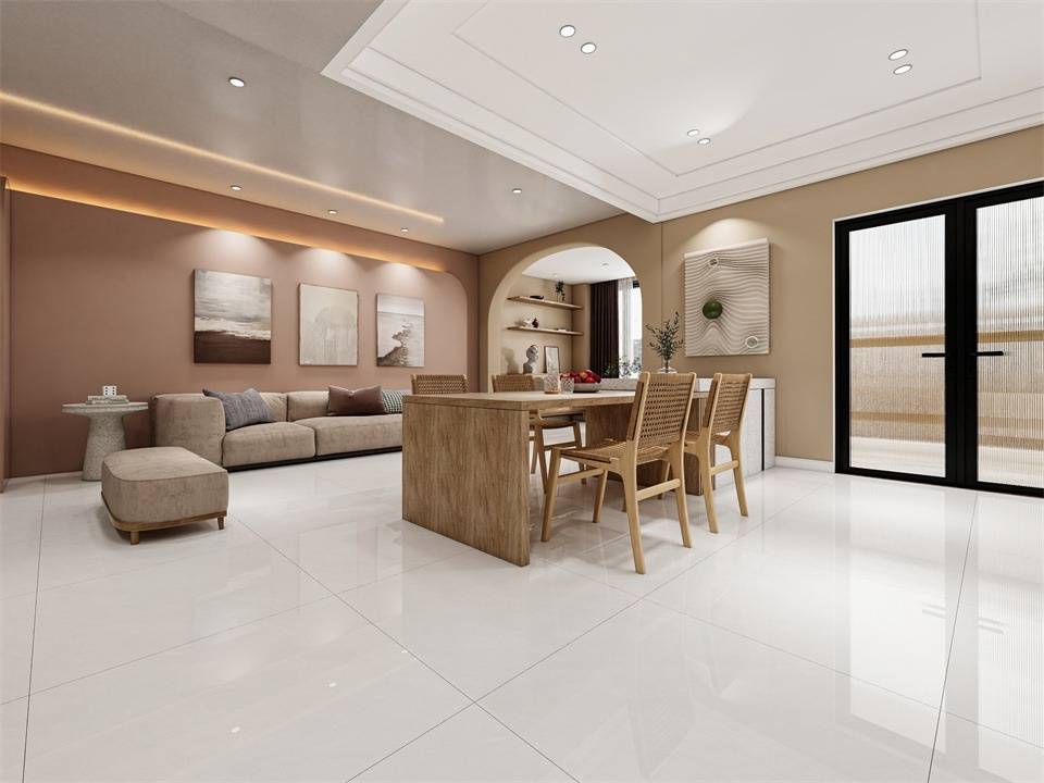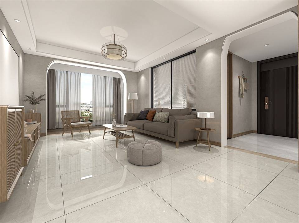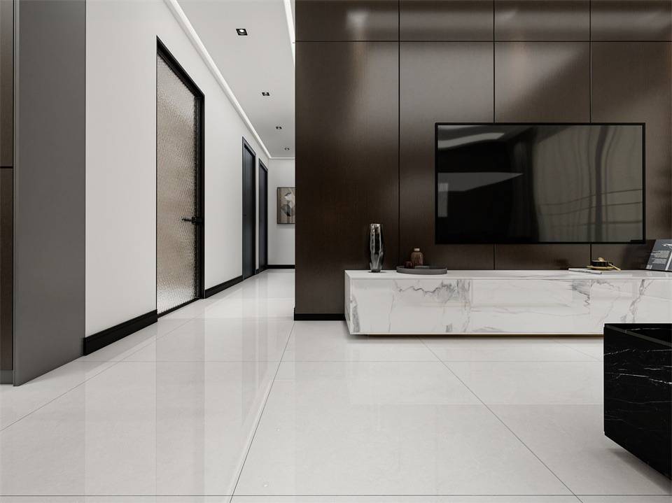 高透超平釉系列三層釉料疊加,再經(jīng)過三道拋光工序,釉面平整有光澤。淡雅的色彩搭配上簡(jiǎn)單的家具燈光后,將空間呈現(xiàn)的更為明亮大氣。